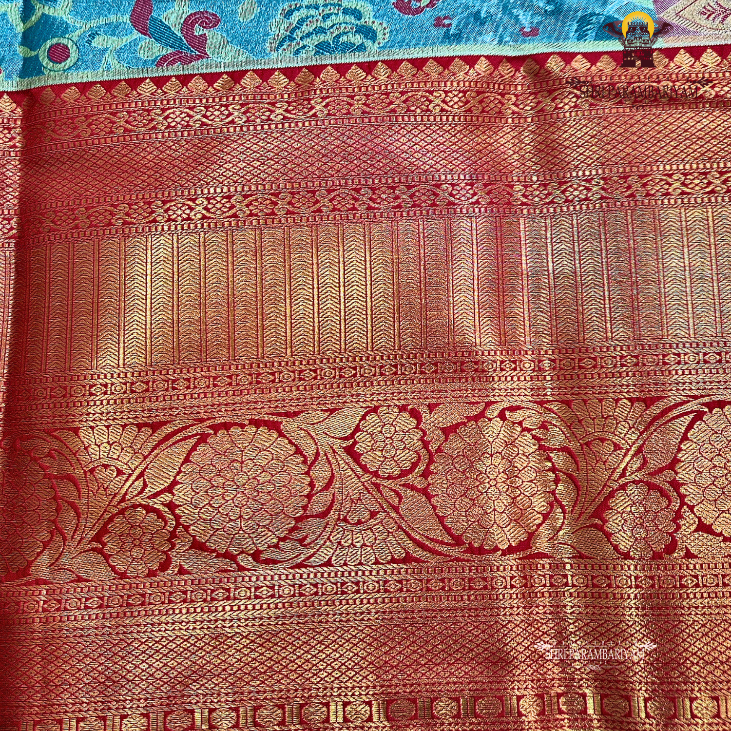 Traditional Semi Silk Tissue Saree featuring a lustrous blue tissue base with delicate floral jacquard weaving across the body. The saree is enhanced with a striking contrast red pallu, richly designed with intricate zari pallakku, floral vines, and geometric patterns, and finished with a timeless zari border. The vibrant contrast and soft sheen make this saree ideal for weddings, festive occasions, and auspicious functions.