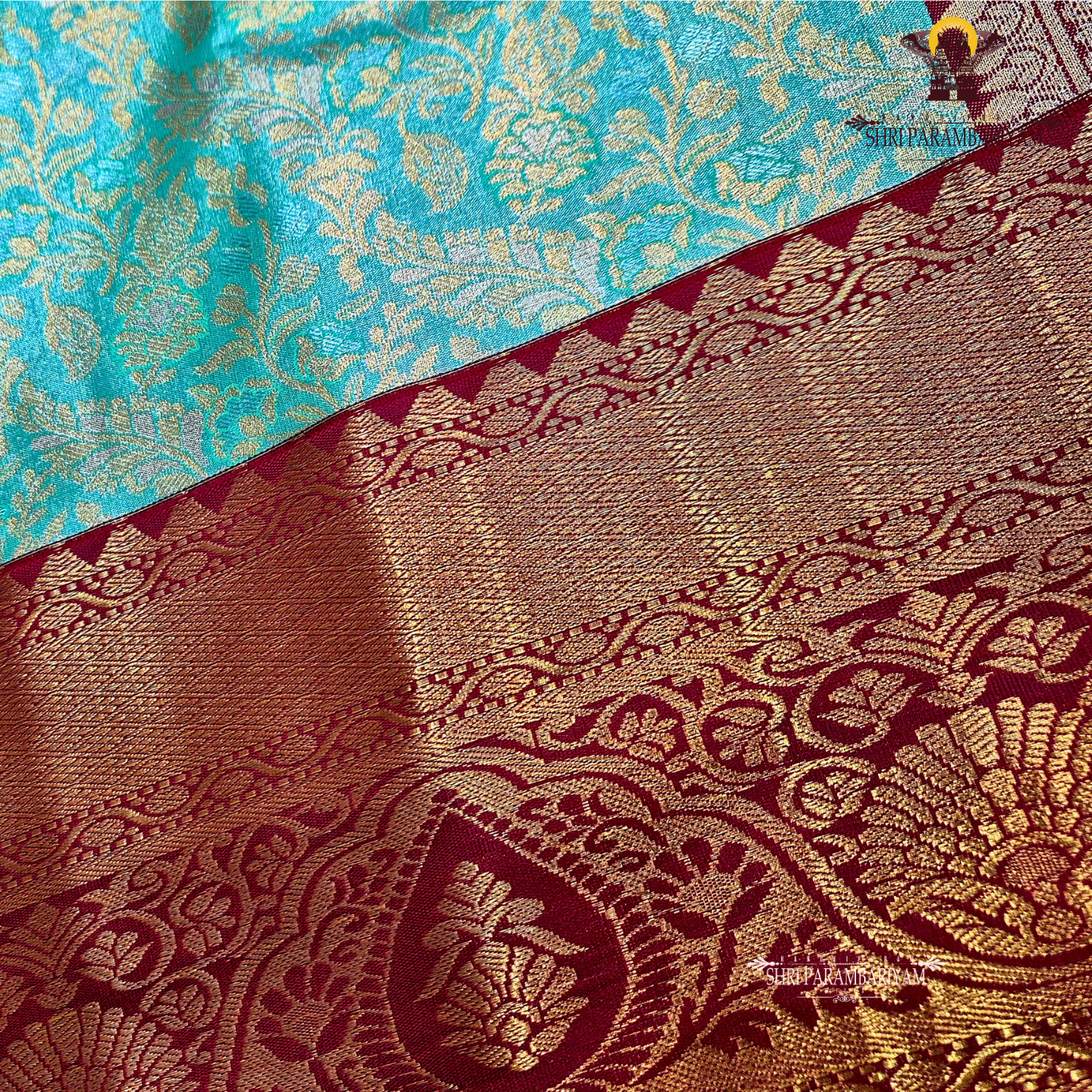 Graceful Semi Silk Tissue Saree featuring a glossy green tissue base adorned with intricate all-over floral jacquard weaving. The saree is elevated by a striking contrast red pallu, richly designed with traditional zari pallakku, geometric patterns, and paisley motifs, and finished with a classic zari border. Soft to drape with festive shine, this saree is ideal for weddings, festivals, and traditional occasions.