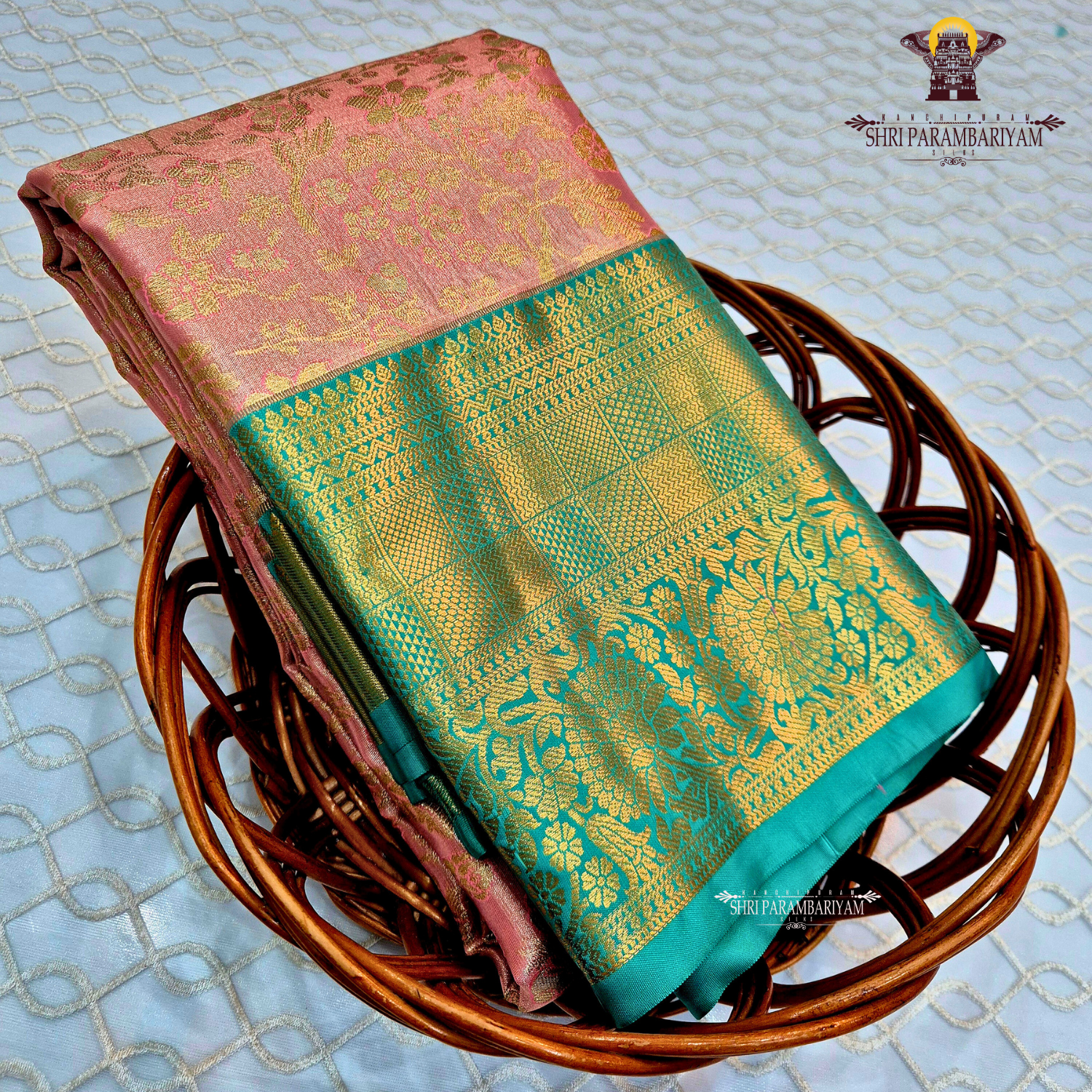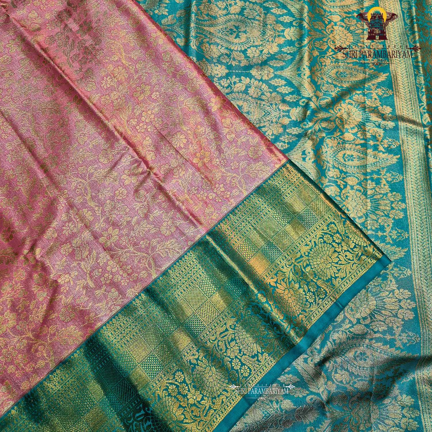 Elegant Semi Silk Tissue Saree featuring a lustrous pink tissue base adorned with intricate all-over floral jacquard weaving. The saree is complemented by a striking contrast green pallu, richly woven with traditional zari pallakku, geometric checks, and floral motifs, finished with a classic zari border. Lightweight with a subtle sheen, this saree is perfect for weddings, festive occasions, and special celebrations.