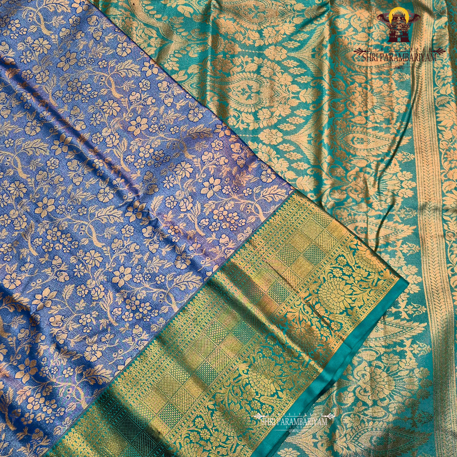Graceful Semi Silk Tissue Saree featuring a lustrous blue tissue base adorned with delicate all-over floral zari motifs. The saree is beautifully complemented by a contrast green pallu richly woven with traditional zari pallakku, geometric checks, and floral designs, finished with a classic zari border. Lightweight, glossy, and festive-ready—ideal for weddings, functions, and traditional occasions.