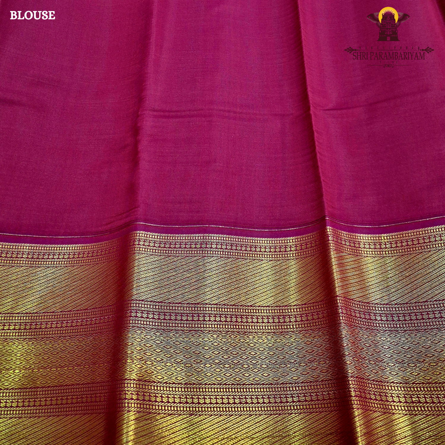 This elegant semi Meenakari silk saree features a vibrant green body adorned with all-over woven Meenakari mango/floral butta motifs in antique gold zari, giving it a refined traditional appeal. The saree is complemented by a contrast maroon Korvai-style border, intricately detailed with geometric, diagonal, and zari-rich patterns. The richly woven pallu enhances the grandeur while maintaining a lightweight semi-silk drape—ideal for festive occasions, weddings, and traditional functions.