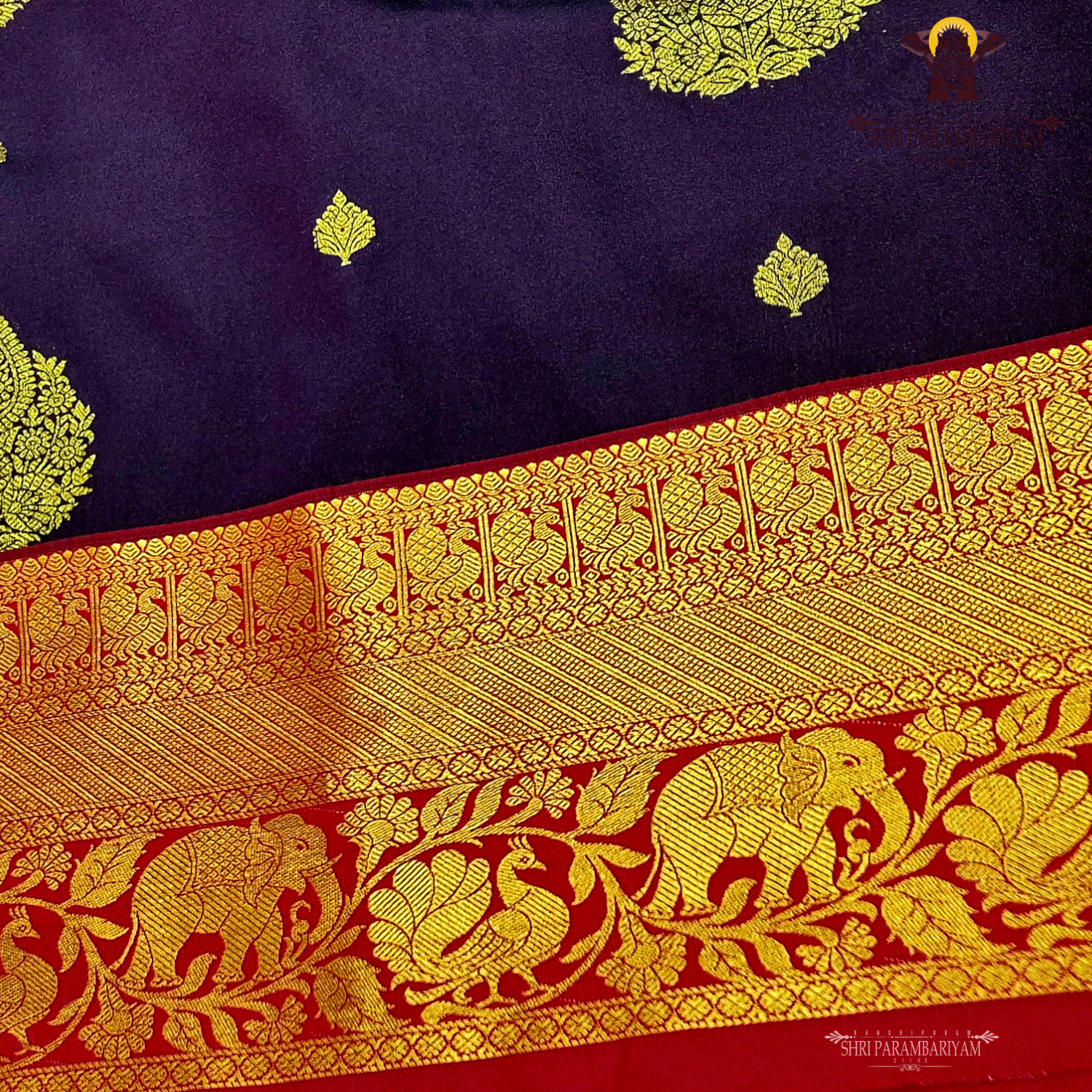 This stunning semi silk Vanaraja set saree features a rich royal purple body highlighted with elegant gold zari Vanaraja (peacock-inspired) motifs, symbolizing grace and tradition. The saree is beautifully paired with a contrasting maroon red border and pallu, intricately woven with traditional Vanaraja, floral, and vine-style zari patterns that add a grand, festive appeal.