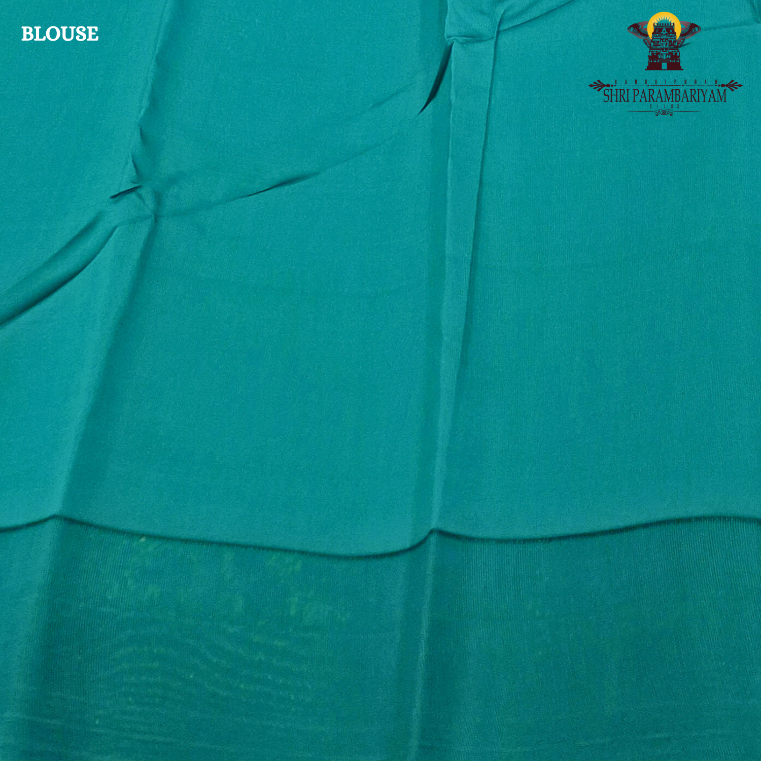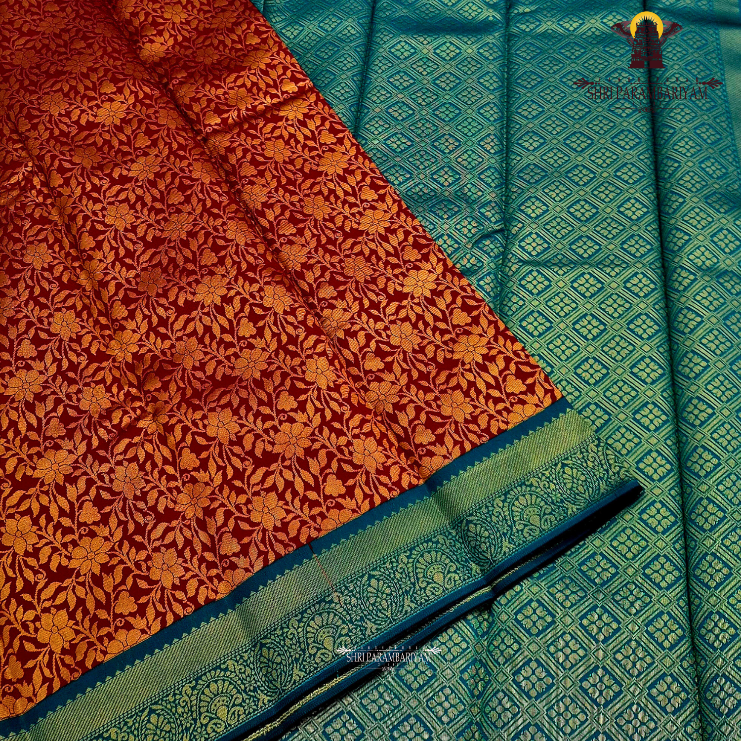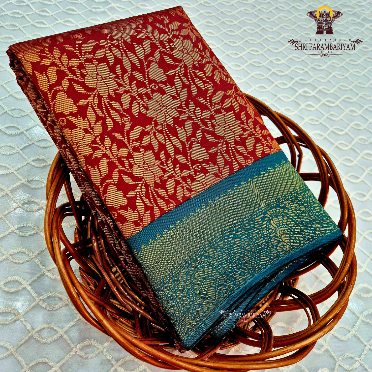 This elegant semi meenakari saree features a rich maroon body beautifully woven with large floral brocade motifs in soft gold zari, giving it a graceful and traditional appeal. The contrasting bottle green border and pallu are enhanced with meenakari-inspired zari weaving and classic traditional patterns, adding depth and richness to the saree. A perfect pick for weddings, temple functions, and festive celebrations.