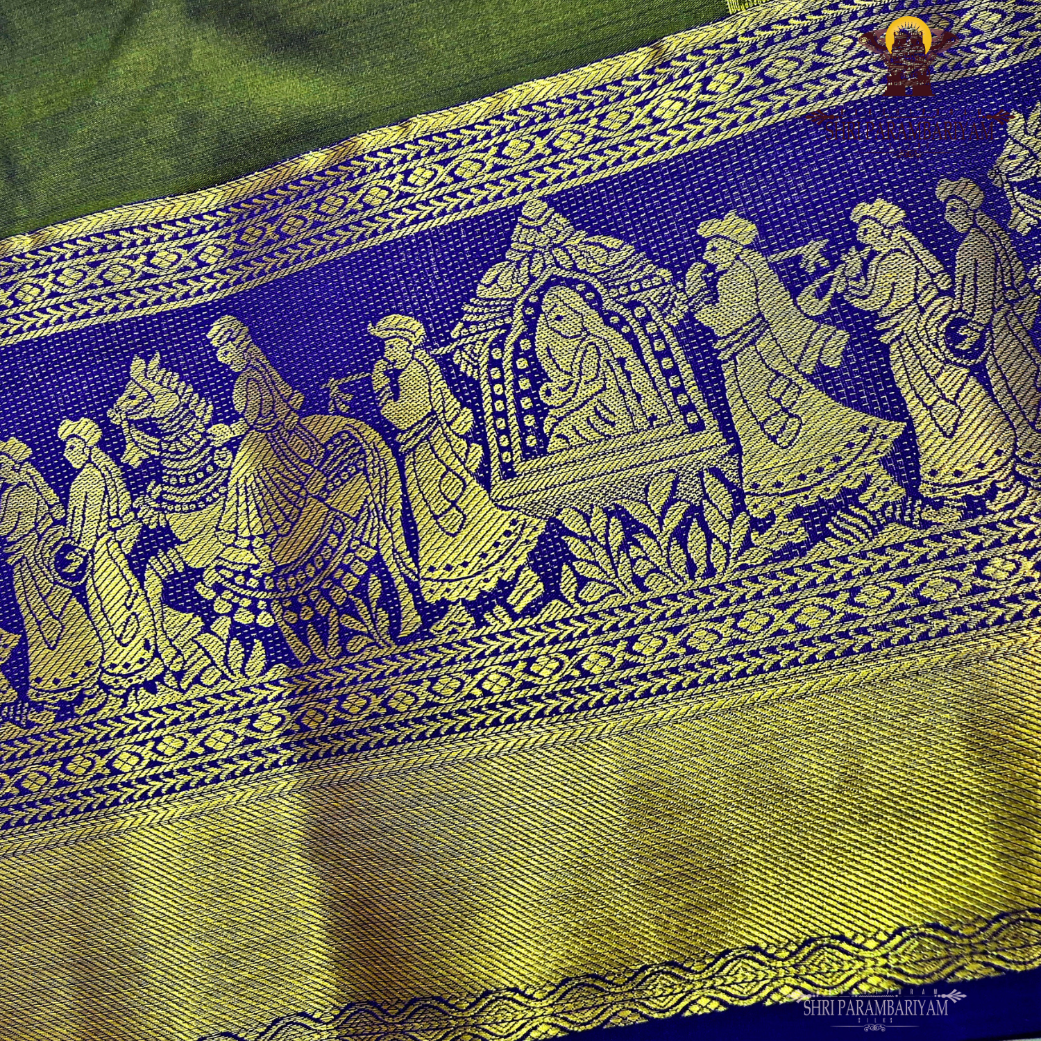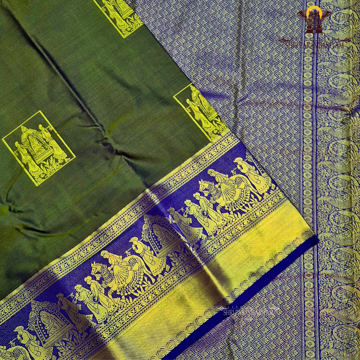 This elegant semi silk Pallakku saree features a sophisticated olive green body that gives a calm, earthy, and royal appeal. The saree is beautifully highlighted with a contrasting royal blue pallu and border, intricately woven with antique gold zari Pallakku motifs depicting a traditional royal procession scene. The detailed zari work, combined with classic temple-inspired patterns, adds depth and heritage richness to the saree.