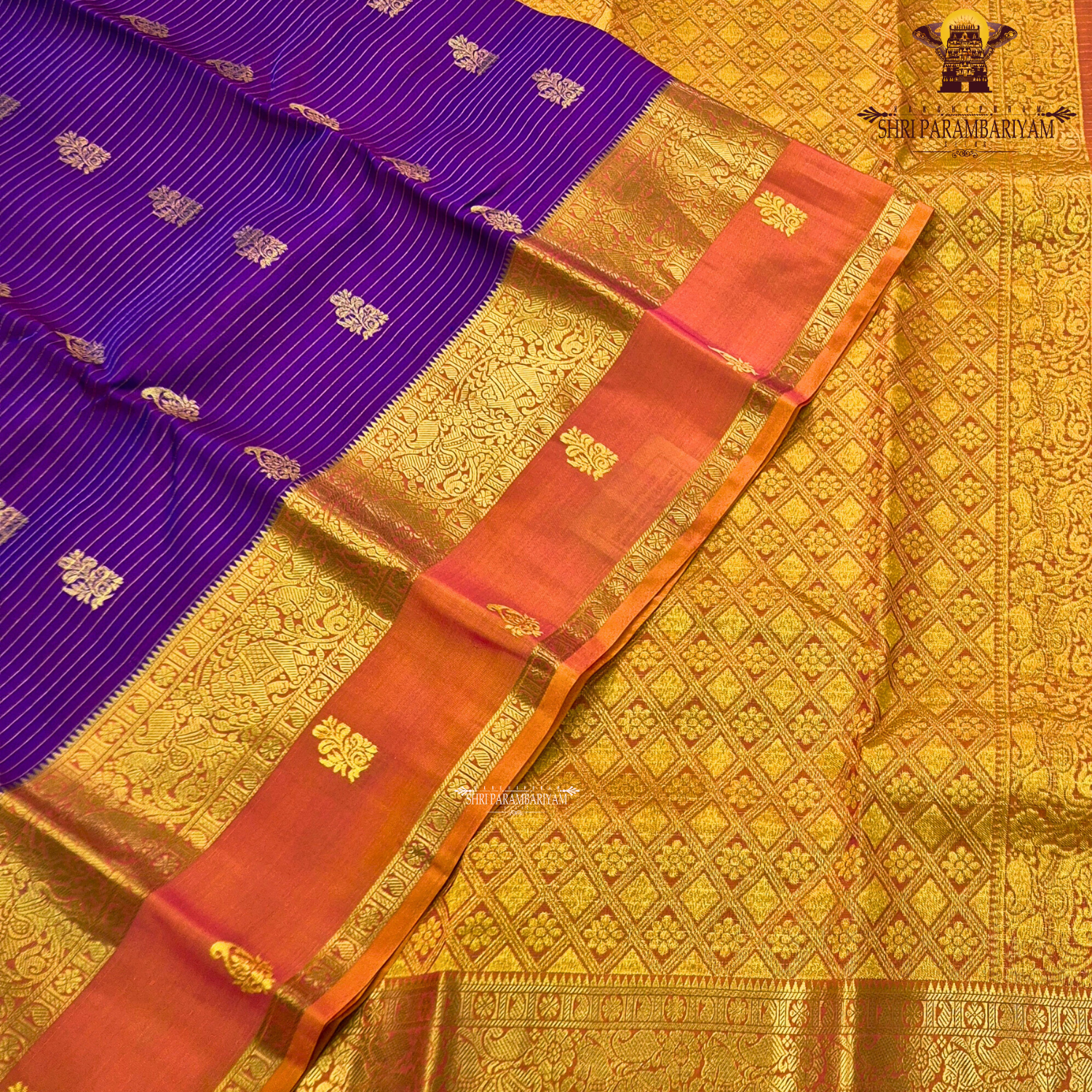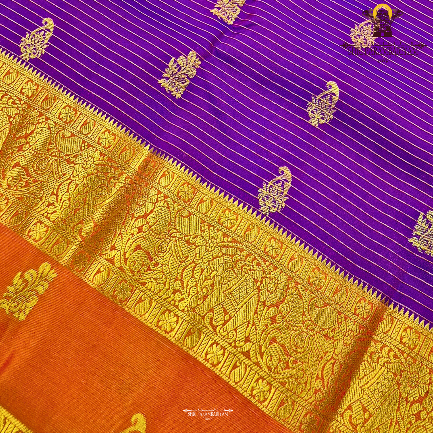 Deep royal purple body with rust orange contrast pallu and rich antique gold zari Saree