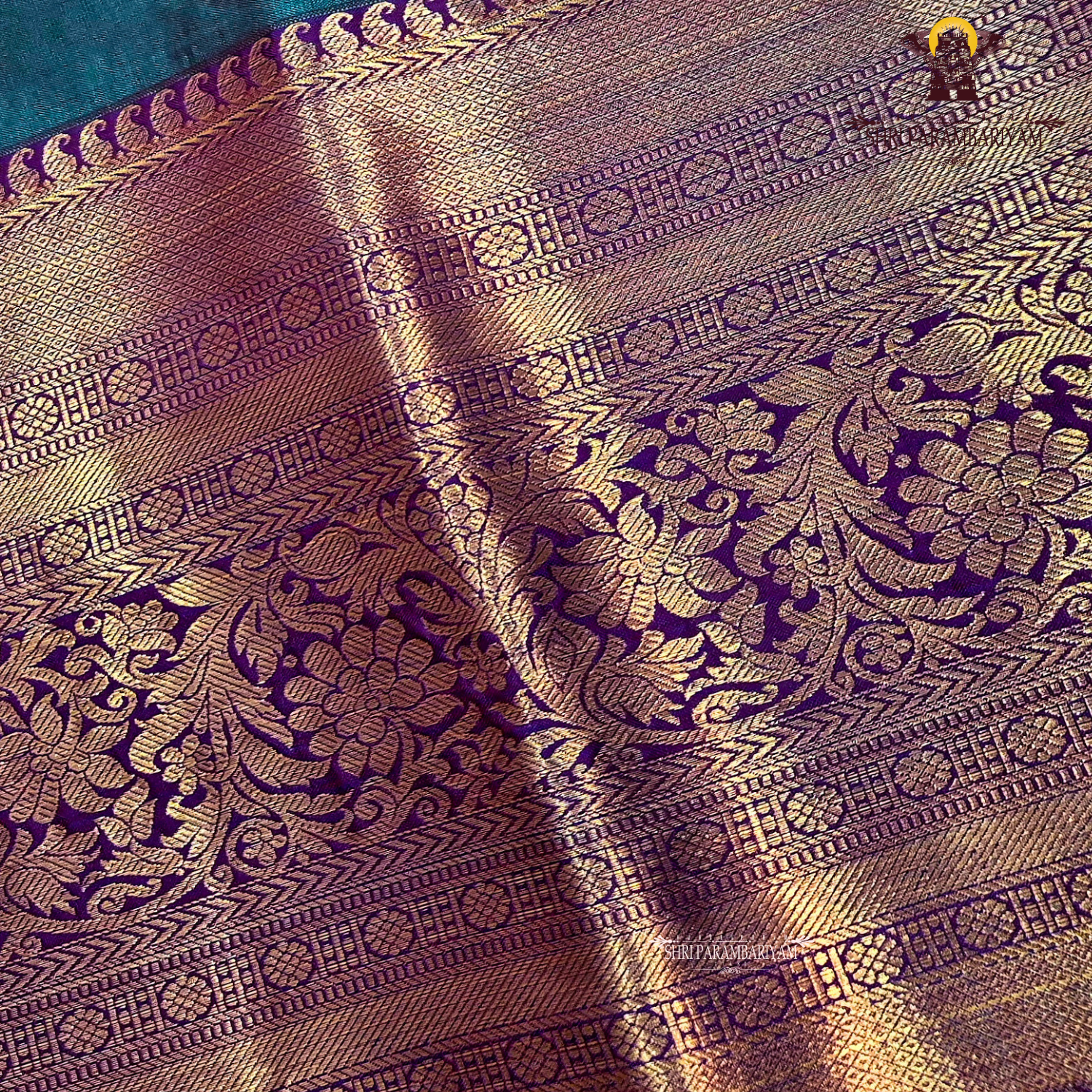 This is a semi silk Korvai saree crafted with a striking contrast Korvai border, where the border and body are woven separately and joined seamlessly. The saree features a broad purple zari border adorned with traditional floral and peacock motifs, highlighted with fine geometric zari lines that add depth and richness. The elegant teal green body enhances the contrast, giving it a timeless, festive appeal.