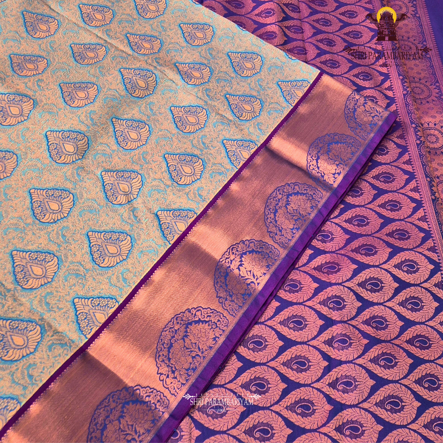 This is a semi silk tissue saree crafted with a graceful copper-toned tissue base that gives a mild shimmer. The body is adorned with classic paisley motifs in royal blue, lending a traditional yet refined look. The contrasting purple zari border enhances richness, while the copper zari pallu with floral medallion designs adds a festive finish. Ideal for weddings, temple wear, and special occasions, this saree blends tradition with understated elegance.