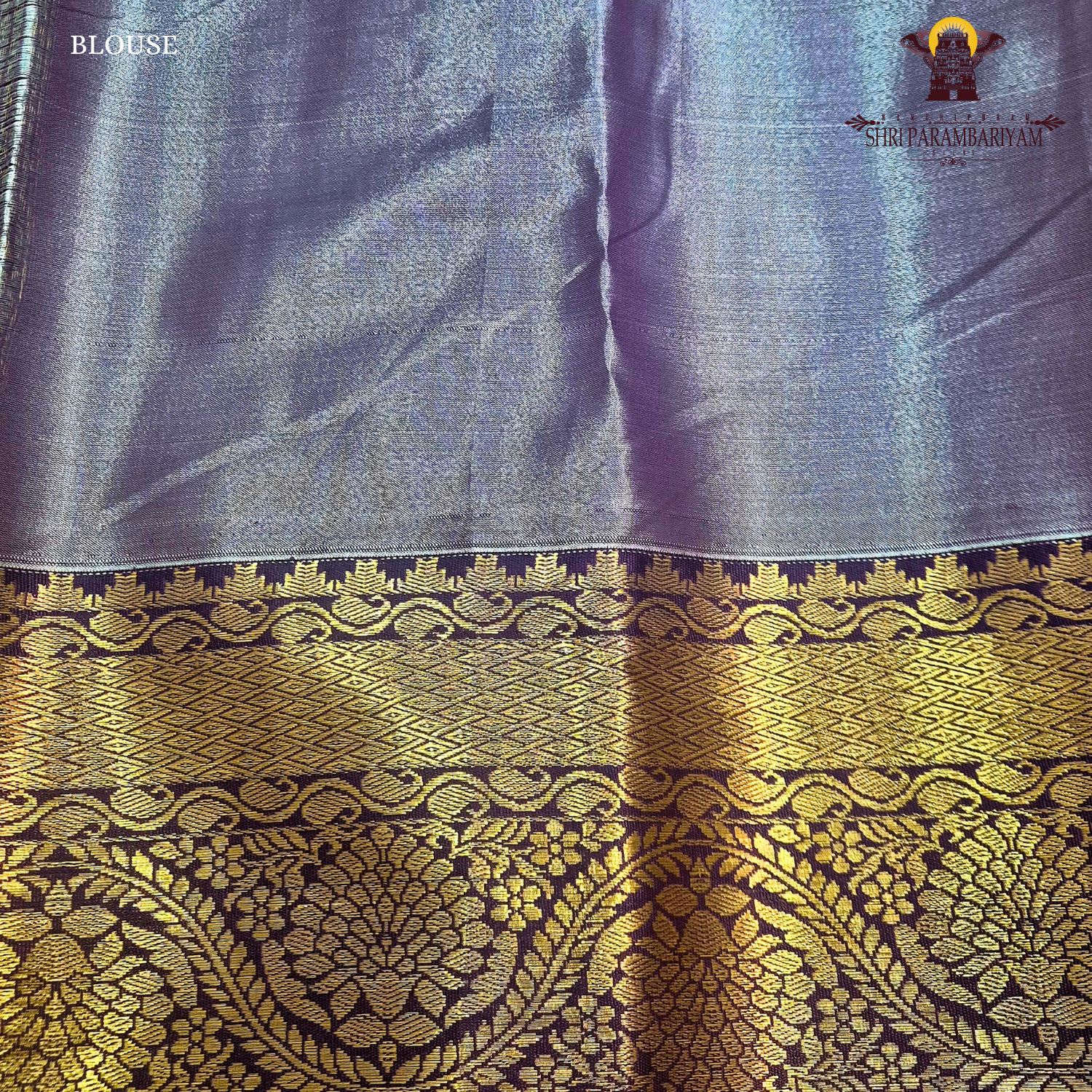 This luxurious semi silk tissue saree features a radiant gold tissue base blended with a refined champagne beige tone, giving it a soft, luminous sheen. The body is adorned with delicate all-over floral and paisley zari motifs, creating a graceful and timeless appeal. The contrasting royal purple / plum border and pallu are richly woven with intricate geometric patterns, floral zari designs, and traditional temple-inspired detailing, adding depth and regal charm.