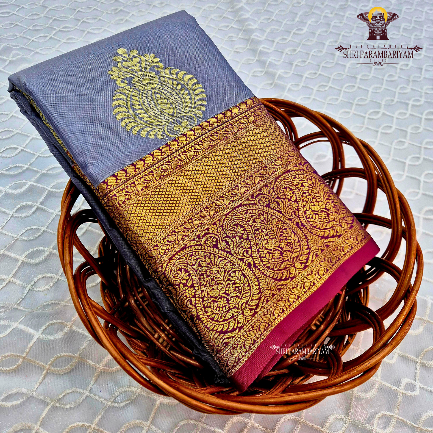 This is a graceful semi silk Korvai saree featuring a striking contrast wine Korvai border, woven separately and expertly joined to the body using the traditional Korvai technique. The broad border and pallu are highlighted with intricate antique gold zari paisley and floral motifs, complemented by fine geometric zari patterns. The subtle steel grey body with a zari mango motif adds a refined, contemporary touch while maintaining a classic look.