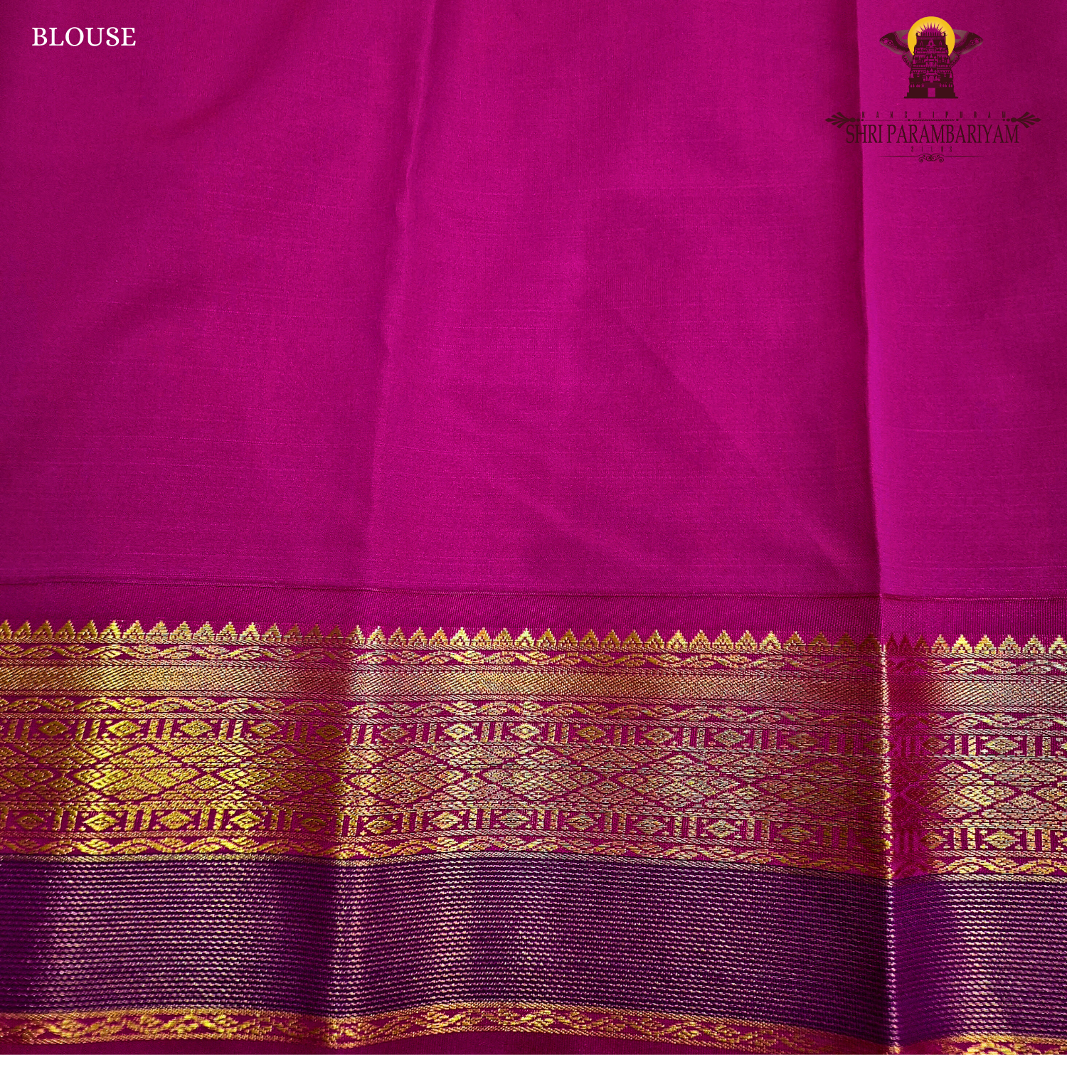This beautiful semi silk fancy buttas saree comes in a soothing peach body highlighted with elegant gold zari fancy buttas evenly woven across the fabric, giving it a graceful and classy look. The saree is paired with a striking magenta contrast border and pallu, richly crafted with traditional gold zari geometric and temple-inspired designs.
