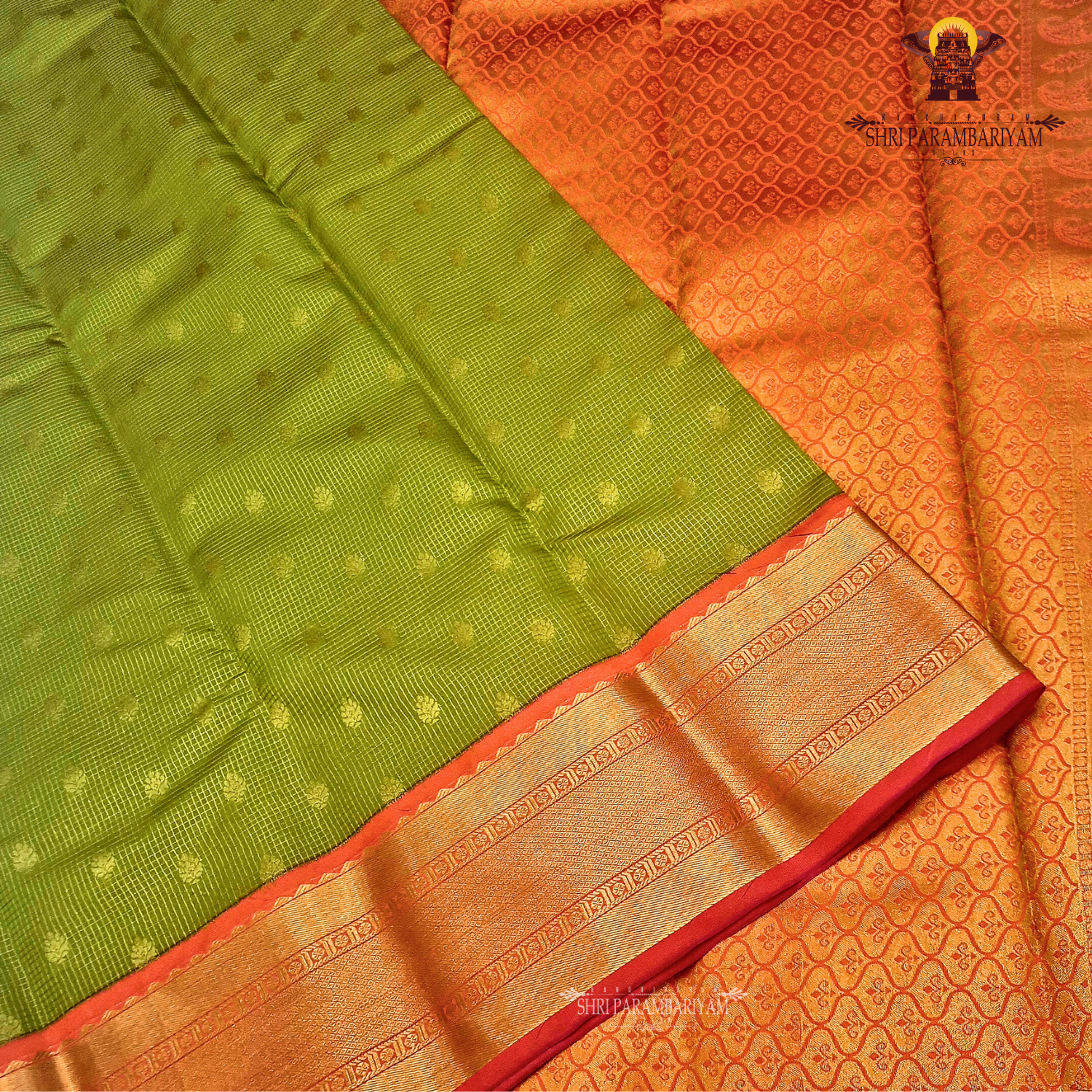 This graceful semi silk Vairaoosi saree features a fresh parrot-green checked body woven with delicate gold zari lines, giving it a vibrant yet traditional appeal. The subtle zari buttas add charm to the body. The contrasting coral-orange border and pallu are beautifully woven with classic geometric and temple-style zari motifs, creating a striking festive contrast.