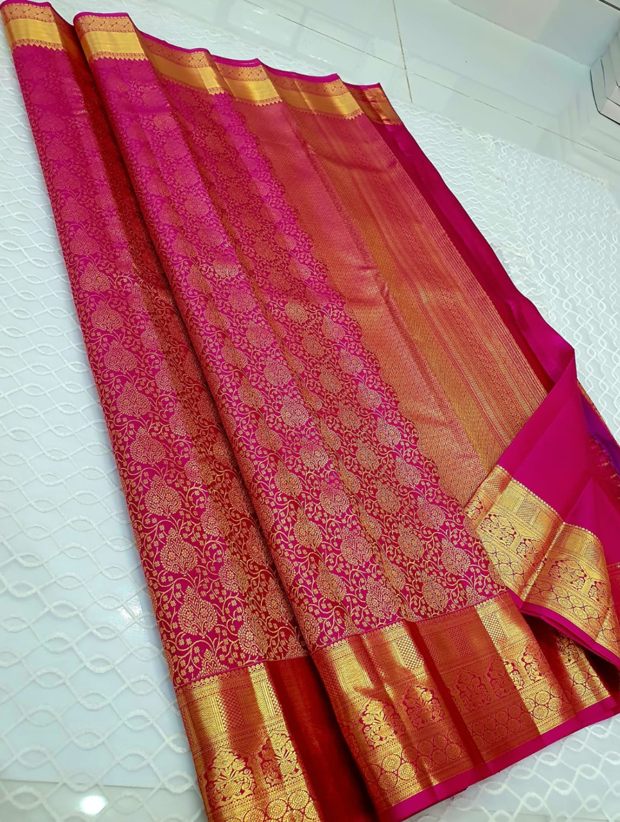 Radiant Rani Pink Bridal Kanjivaram Silk Saree dazzles with intricate golden zari motifs, a shimmering pallu, and bold border—crafted in fine silk for weddings, festive celebrations, and grand occasions.
