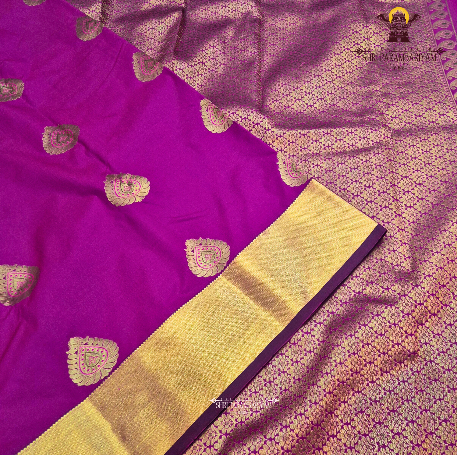 This beautiful semi-fancy Korvai saree comes in a rich rani pink body, highlighted with elegant gold zari butta work. Woven in the traditional Korvai technique, the saree features a contrast antique gold zari border and pallu with fine geometric zari patterns that enhance its festive appeal.