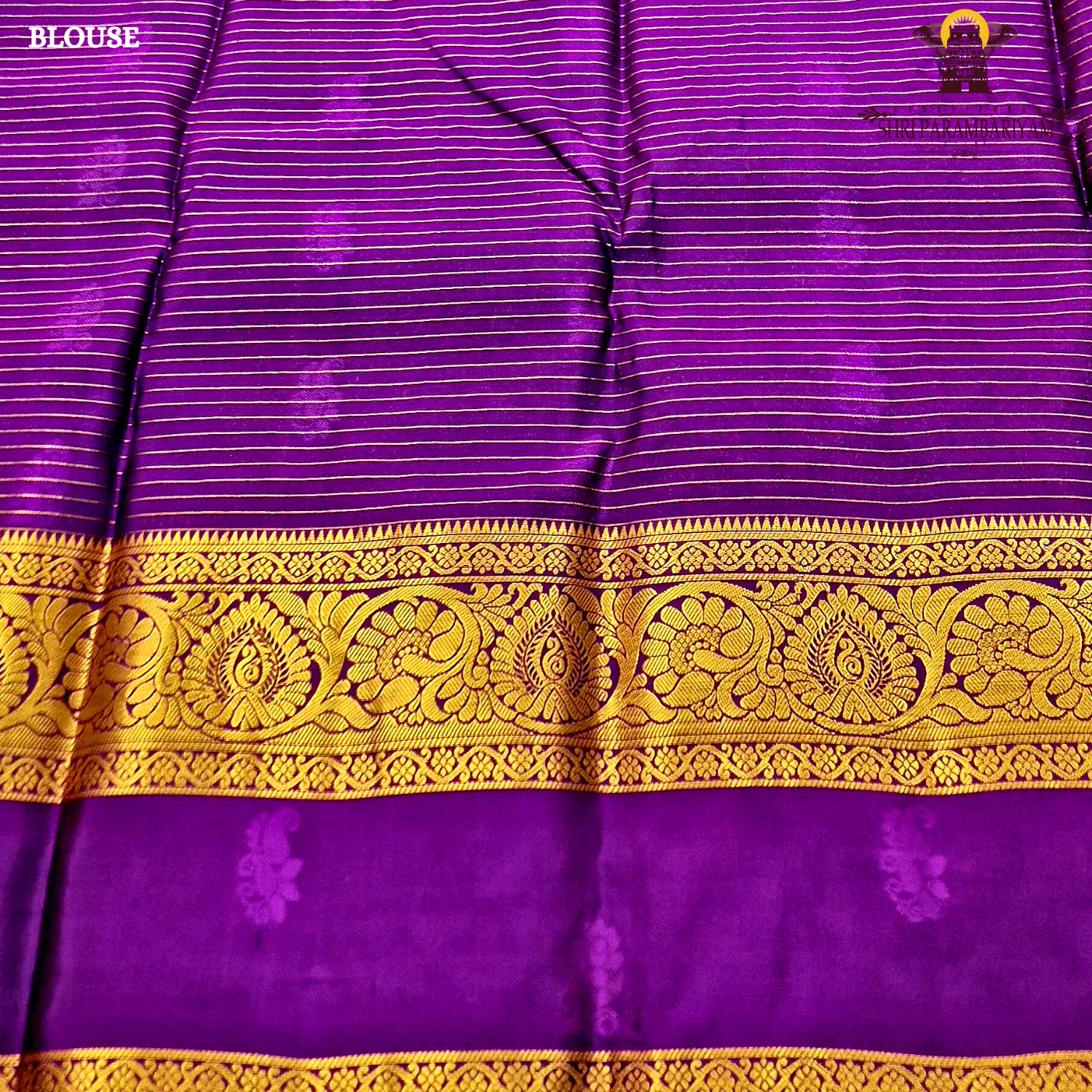 This fancy pure vintage saree features a classic coffee-brown base highlighted with fine zari stripe patterns and traditional butta motifs. The contrasting royal purple pallu and border are beautifully woven with intricate antique gold zari floral and paisley designs, giving a timeless traditional appeal. The elegant texture, heritage color combination, and detailed vintage weaving make it perfect for festive occasions, weddings, and cultural celebrations, offering a graceful and sophisticated ethnic look.