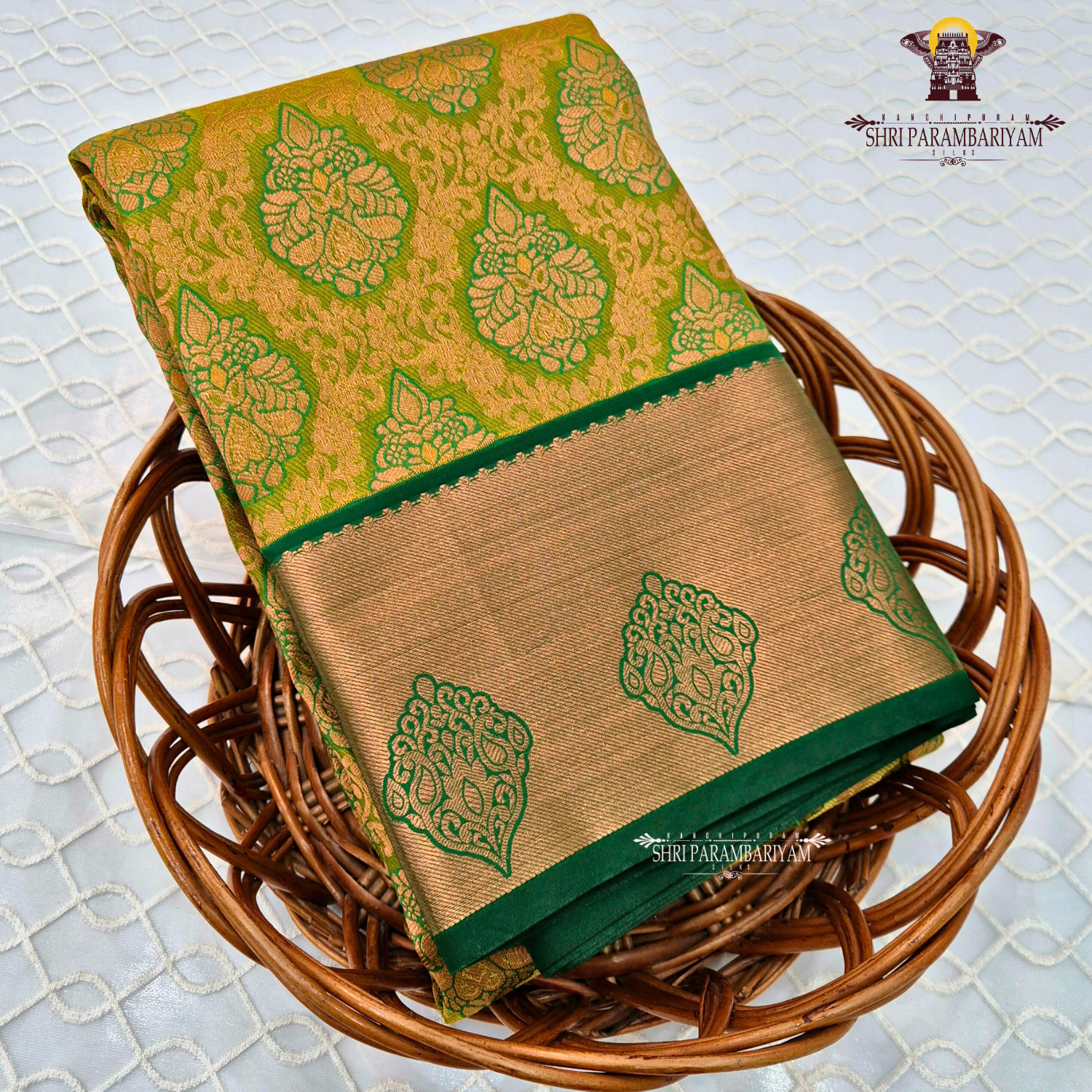 This semi silk tissue saree features a luminous golden-mustard base enhanced with a subtle metallic finish. The body is beautifully decorated with classic green paisley (mango) motifs, giving it a timeless South Indian traditional appeal. The contrasting deep green zari border adds definition and richness, while the gold tissue pallu with intricate green motifs completes the look gracefully. A perfect choice for weddings, festive occasions, temple wear, and traditional functions.