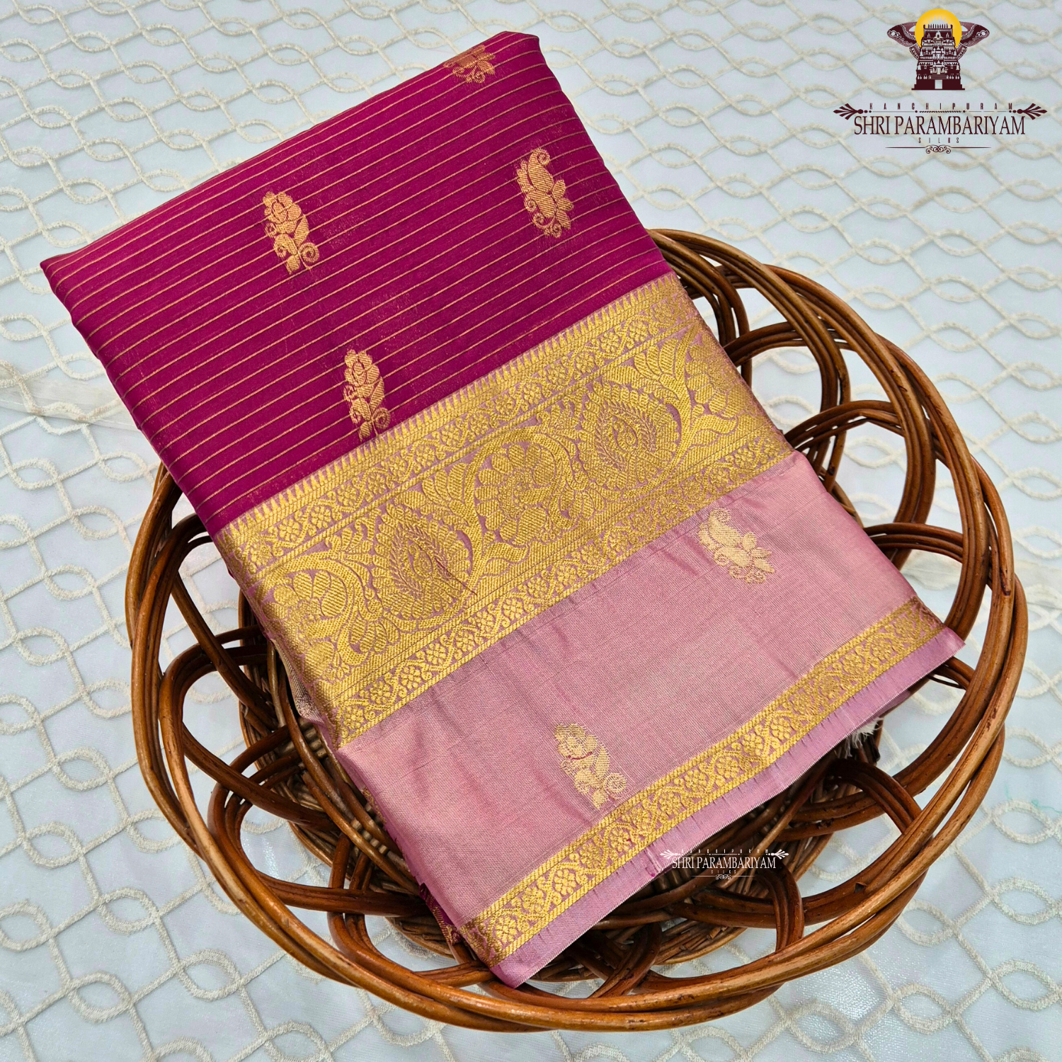 This fancy pure vintage saree features a vibrant magenta pink base adorned with fine zari stripe patterns and elegant traditional butta motifs. The contrasting pastel pink pallu and border are beautifully woven with intricate antique gold zari floral and paisley designs, giving it a timeless classic appeal. The smooth texture, heritage-inspired weaving, and graceful color combination make it perfect for weddings, festive occasions, and traditional celebrations, offering a sophisticated and elegant ethnic look.