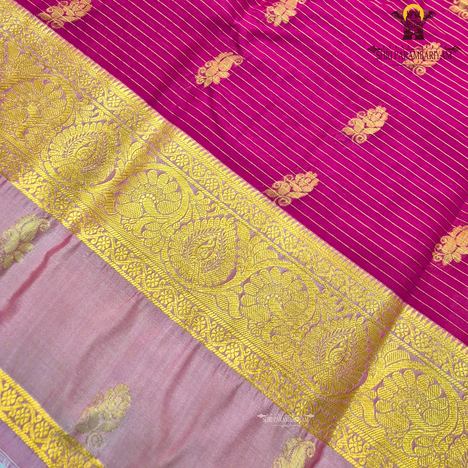 Rich magenta pink body with light pastel pink contrast pallu and antique gold zari Saree