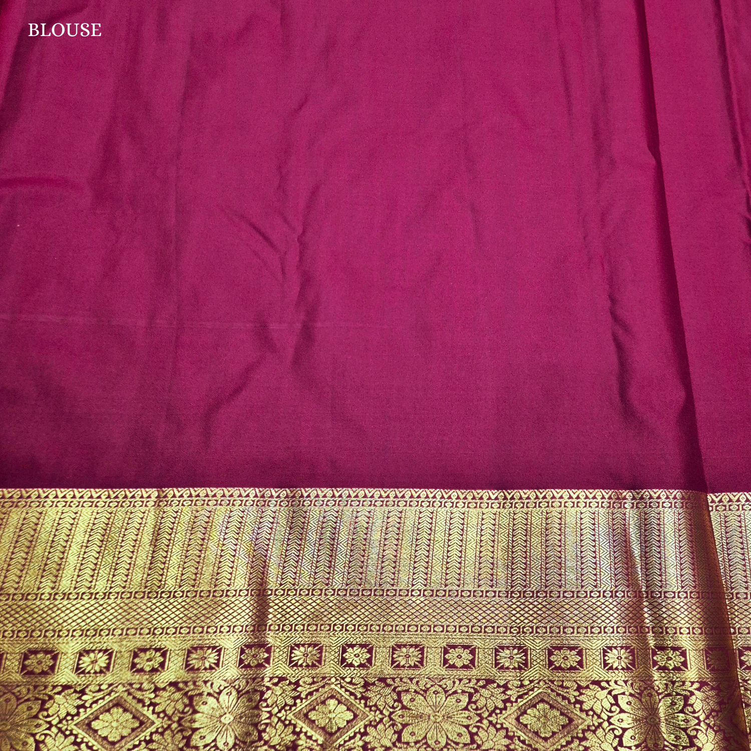 This is a semi-fancy Korvai saree featuring a solid wine-red body that looks elegant and festive. The saree is highlighted with a traditional Korvai contrast border woven in antique gold zari, showcasing intricate geometric checks, floral buttas, and temple-inspired motifs. The lower border is broad and richly detailed, giving a grand look without being too heavy. The pallu and border have classic South Indian weaving elements, making it ideal for functions, festive wear, and traditional occasions.