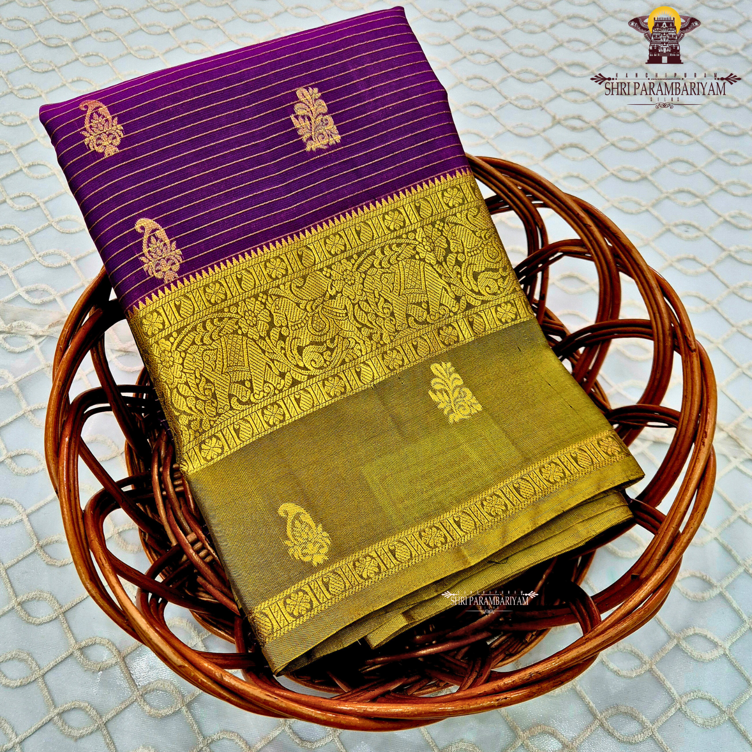 Royal purple body with olive green contrast pallu and rich antique gold zari Saree