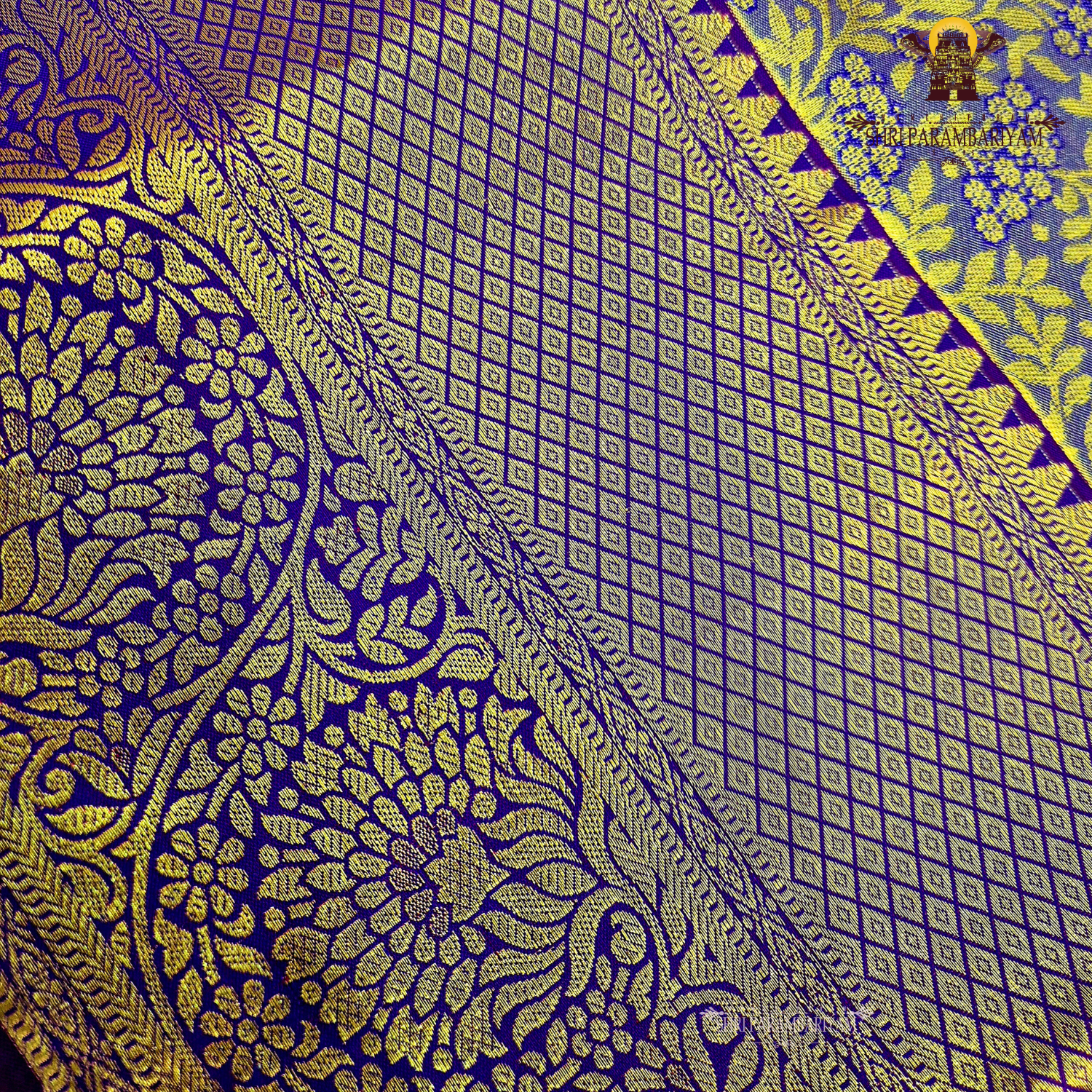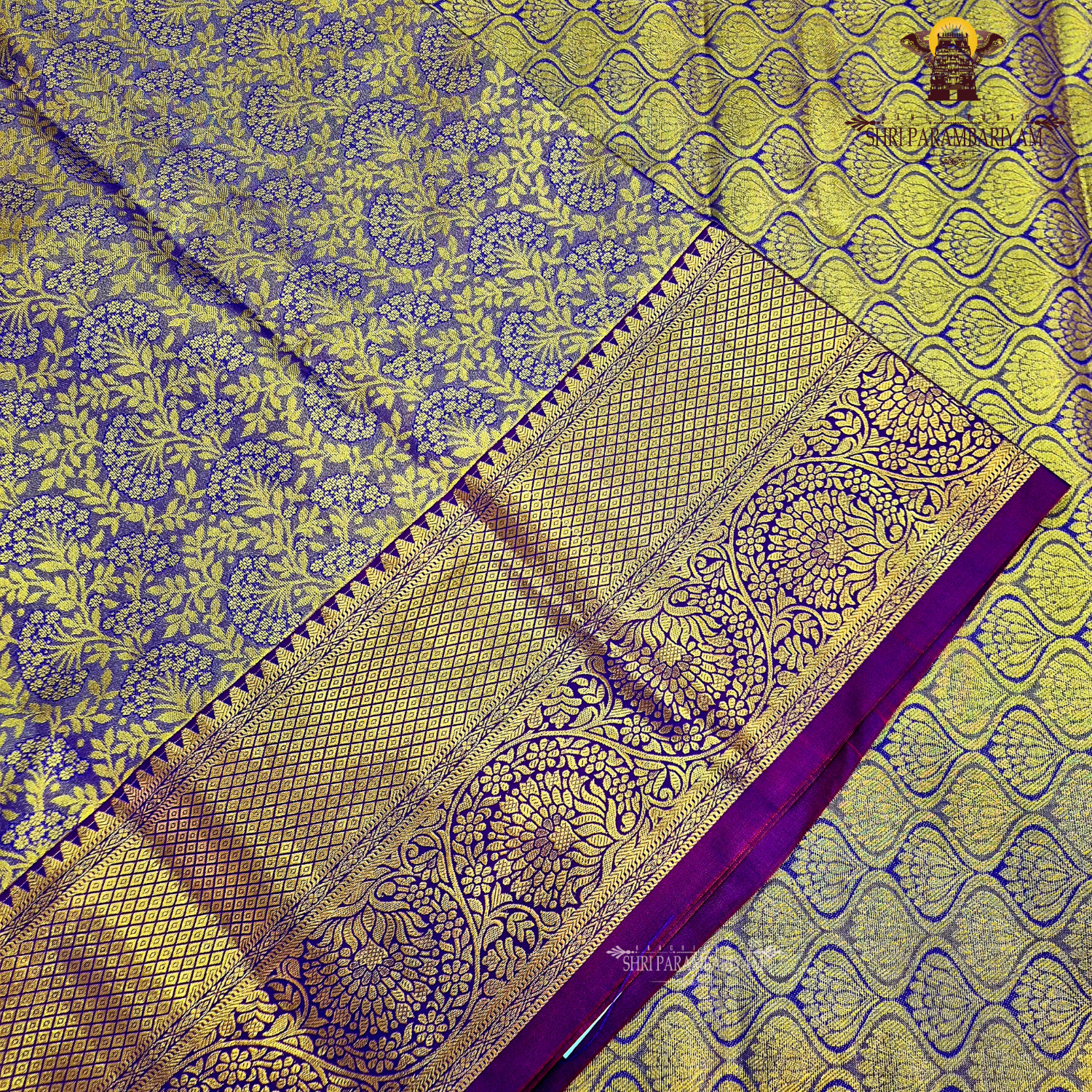 The pallu is richly designed with dense gold zari weaving and ornate floral motifs, adding depth and grandeur to the overall look. With its subtle tissue sheen and rich colour contrast, this saree is ideal for weddings, festive occasions, temple ceremonies, and grand traditional events, offering a perfect blend of sophistication and tradition.