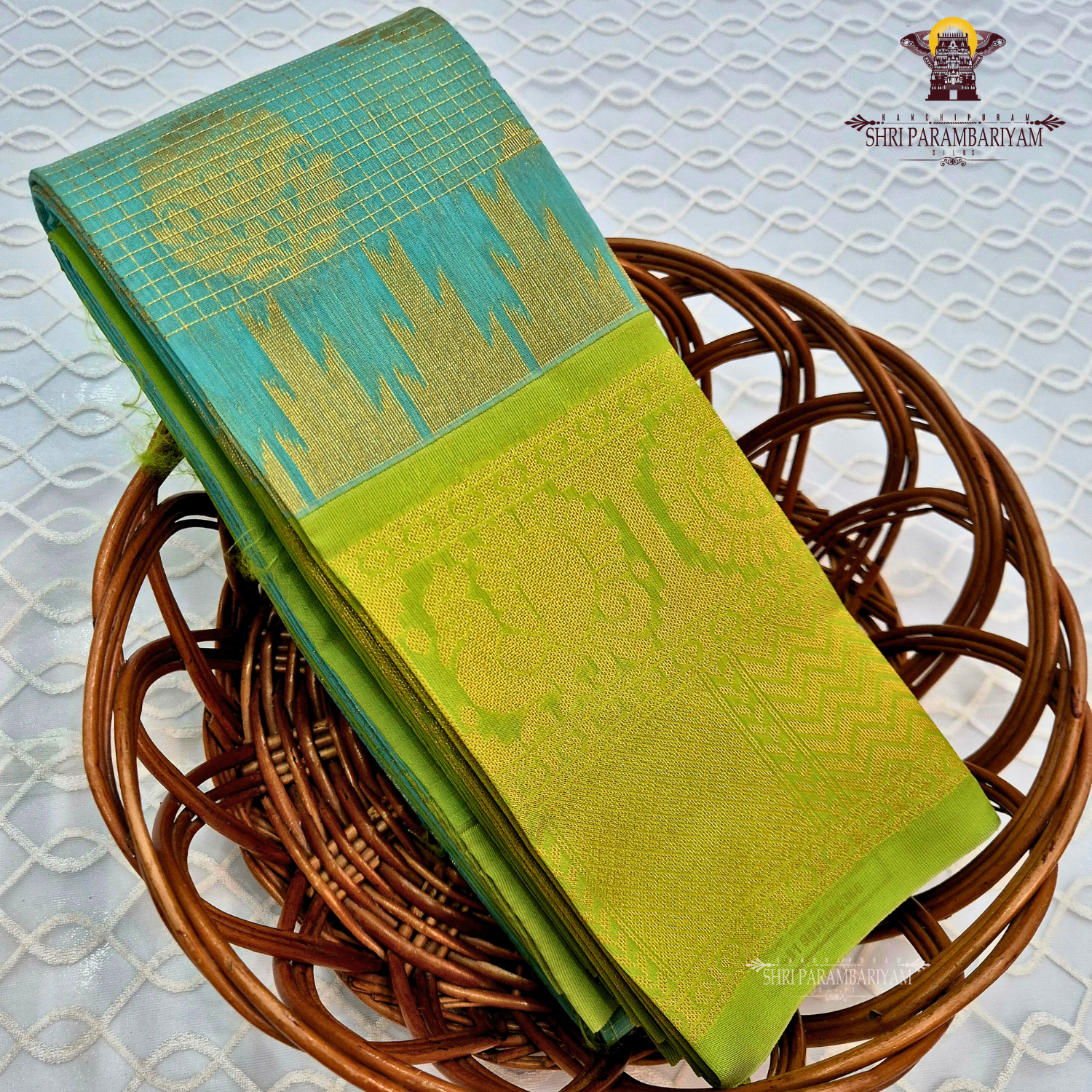 Sea green with elegant gold zari checks and subtle zig-zag temple-style patterns, giving a refined traditional charm, Parrot green with intricate gold zari paisley (mango), floral, and geometric motifs, Classic South Indian temple-inspired design with a neat, rich finish, A fresh, soothing color combination that looks graceful and youthful. Ideal for festivals, poojas, office ethnic wear, weddings, and family functions. Perfect for customers who prefer elegant, bright tones in semi silk cotton sarees.