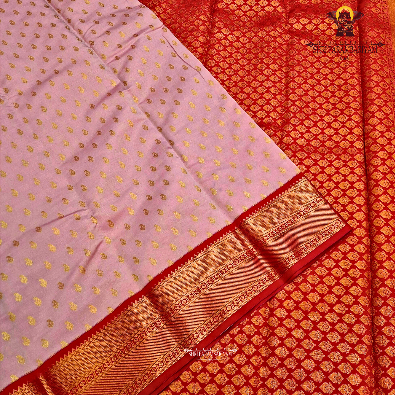 This is a graceful semi silk saree featuring an elegant all-over gold zari butta pattern on a delicate baby pink base. The saree is beautifully highlighted with a contrasting red border and pallu, richly woven with traditional geometric and temple-style zari designs. The soft pastel body paired with a bold red contrast gives it a timeless festive charm, making it ideal for weddings, festivals, poojas, and traditional occasions.