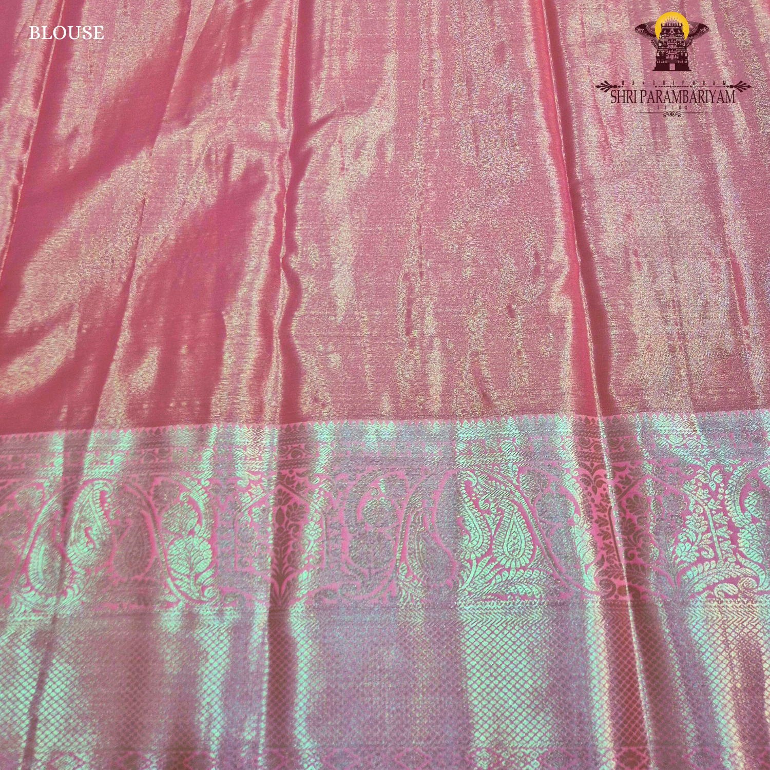 This refined semi silk tissue saree comes in a delicate blush pink tone, enhanced with a gentle shimmering finish. The body features an all-over antique gold zari floral and paisley weave, giving it a luxurious and graceful appeal. The self-colored pink border keeps the look soft and elegant, while the heavily woven tissue pallu adds richness without overpowering the design. Ideal for weddings, receptions, engagements, and sophisticated festive occasions.