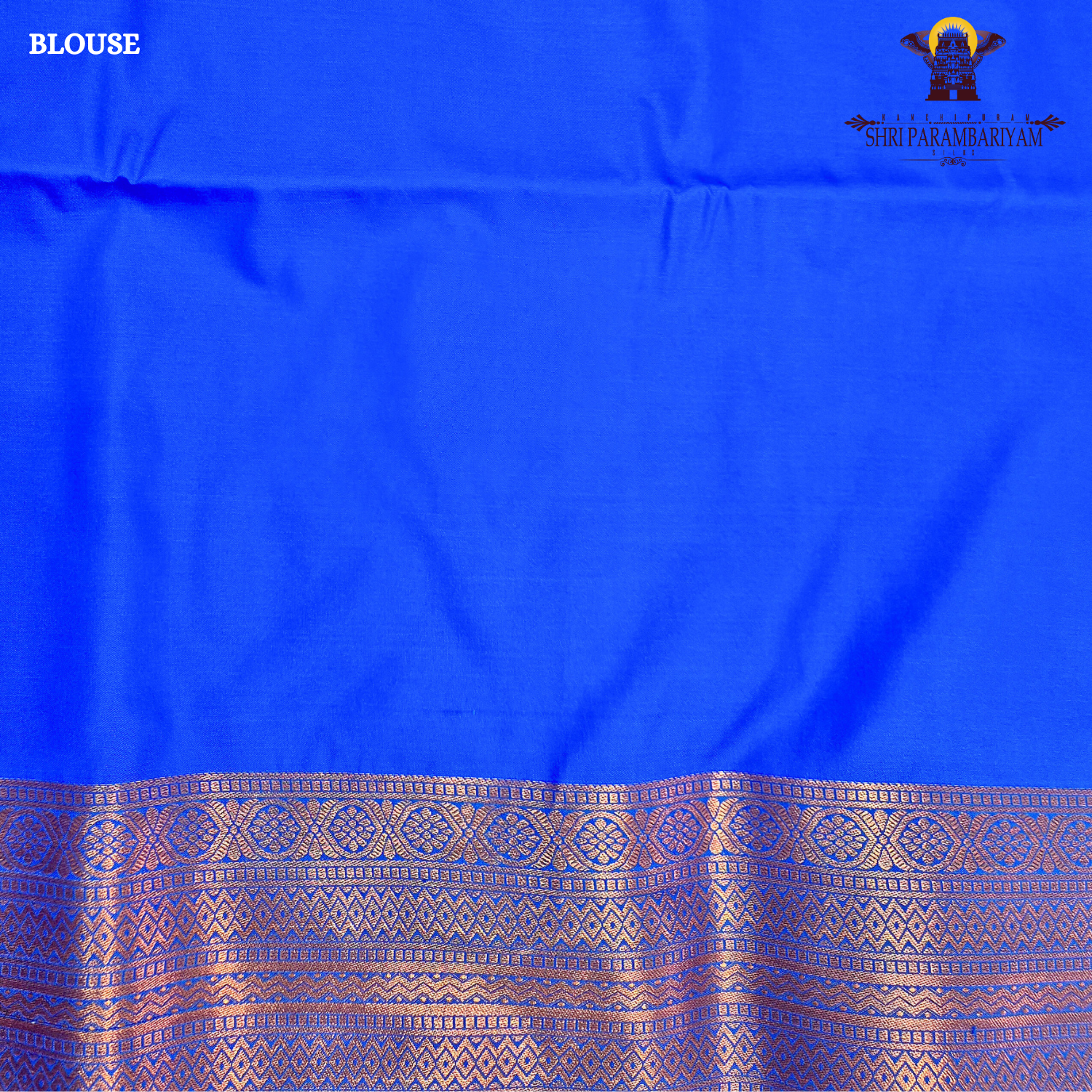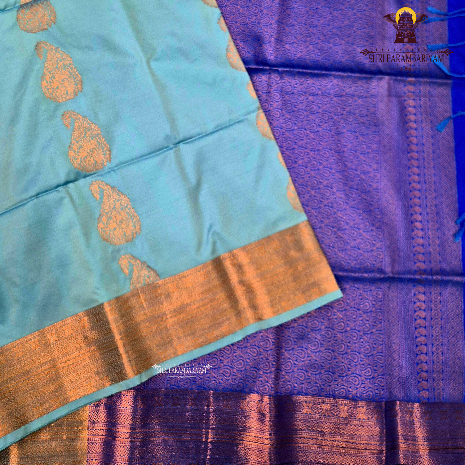 A graceful semi soft silk saree showcasing a smooth pastel blue body adorned with delicately woven paisley (mango) motifs in antique copper zari. The soft silk texture gives a refined sheen and fluid drape, making it lightweight yet rich in appearance. The subtle patterning keeps the look elegant and versatile—ideal for festive gatherings, traditional functions, office wear, and classy day events.