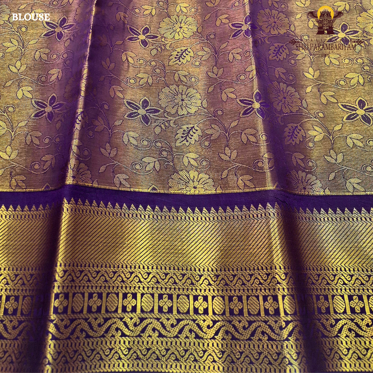 This graceful semi Meenakari silk saree features a refreshing turquoise green body adorned with delicately woven floral and vine Meenakari patterns, giving it a soft sheen and elegant texture. The saree is beautifully contrasted with a royal purple Korvai-style border and pallu, intricately crafted with traditional geometric and ornamental zari motifs. The balanced color combination and refined zari work make this saree ideal for festive occasions, weddings, temple functions, and elegant day events.