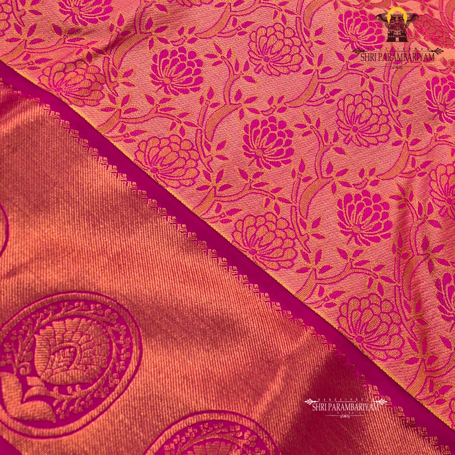 This elegant semi silk tissue saree comes in a charming peach-pink base with a gentle metallic sheen. The body is beautifully adorned with magenta floral vine motifs, giving it a graceful and feminine appeal. The contrasting deep magenta zari border adds richness, while the tissue pallu with intricate round floral zari designs completes the traditional look. A perfect choice for weddings, festive occasions, receptions, and special celebrations.